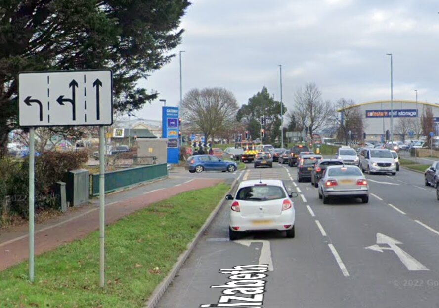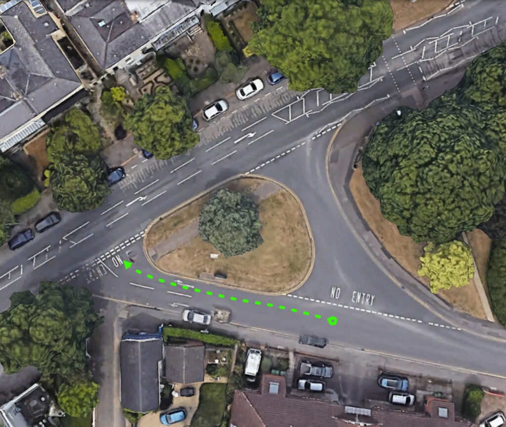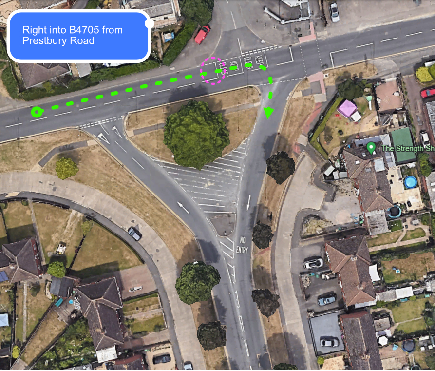 Also known as the ‘D’ junction. The B4705 splits into a short piece of one-way, so turning right at the end is done from the right-hand lane. If you find yourself at the end of the road in the left lane DO NOT attempt to turn right. Change your signal (if you are signalling right) and turn left.