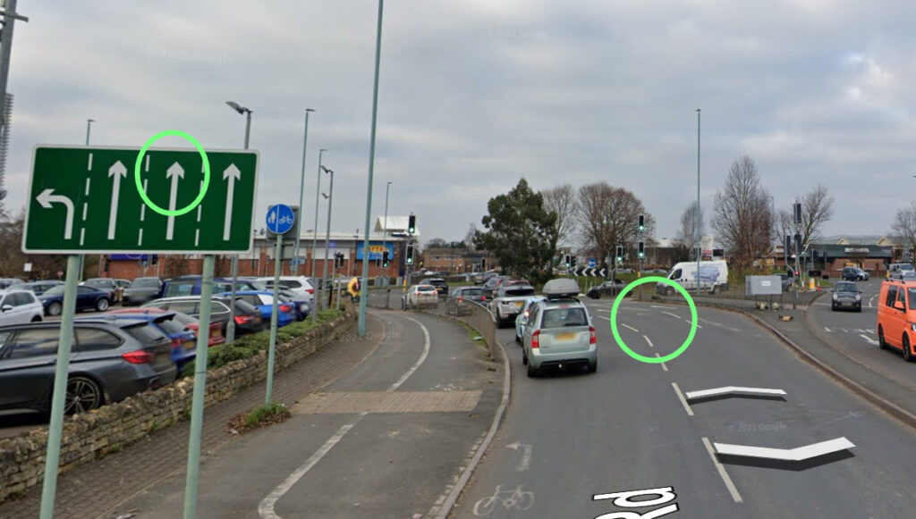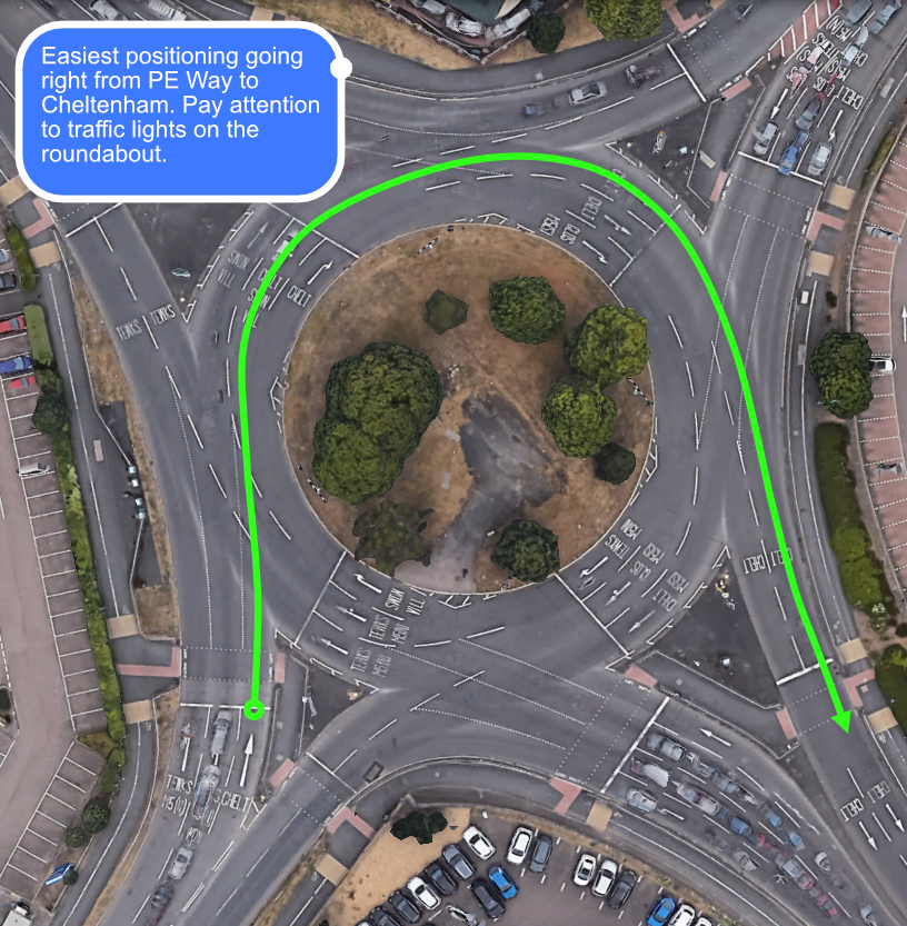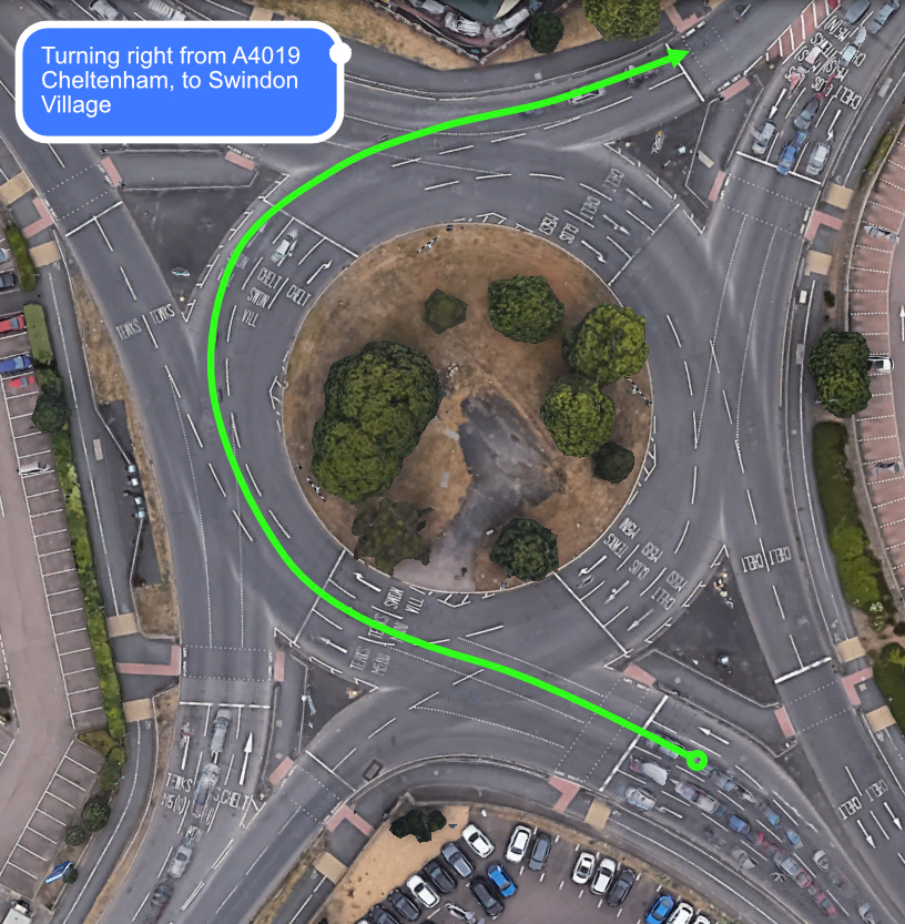 A similar situation turning right from Whaddon Road into Prestbury Road.