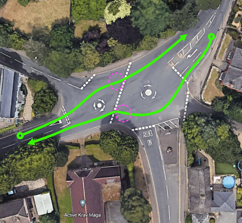 The green lines show the correct positioning, going ahead. The pink dots show where you can wait, if you have to, for traffic from your right (it’s just a roundabout!).