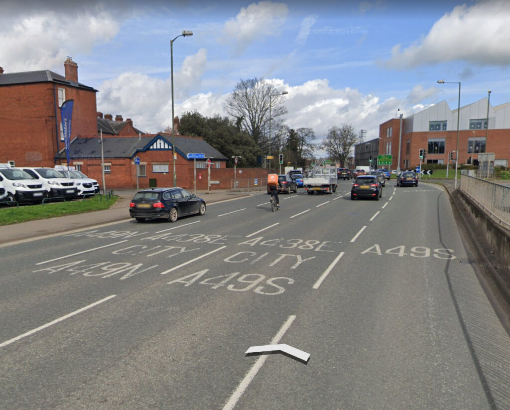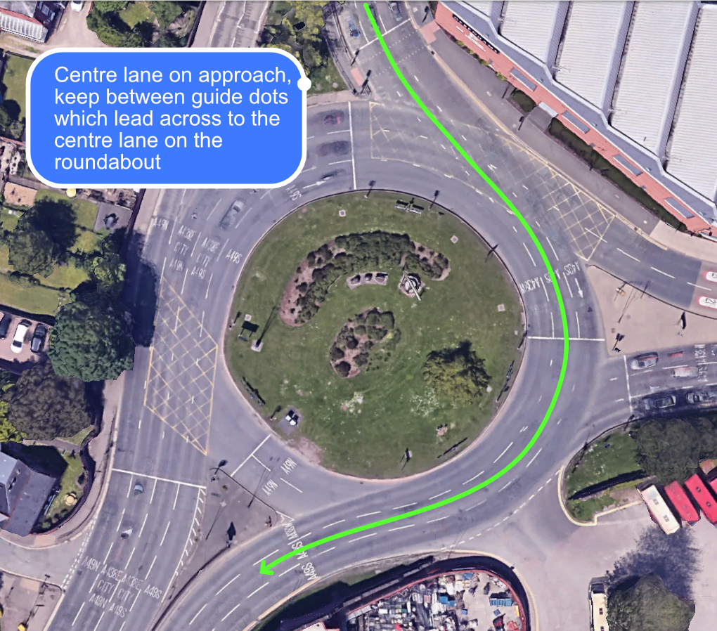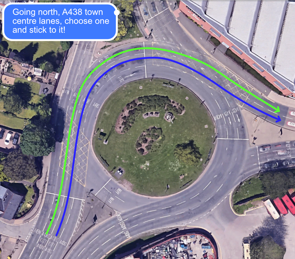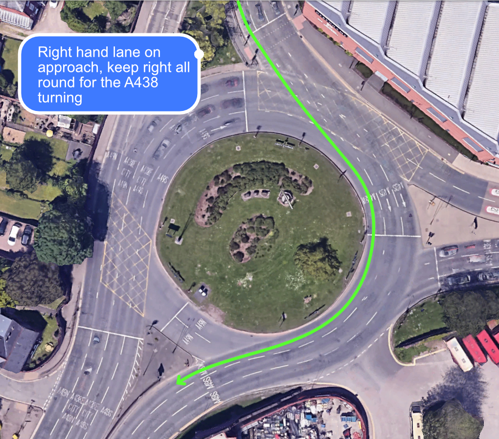 Going south on Edgar Street, turning right to Brecon on the A438. You need the right-hand lane (3, counting from the left, red arrow) on approach.