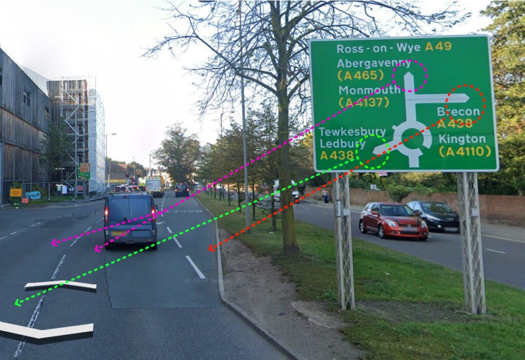 Going south on Edgar Street, towards Ross-on-Wye. Note that both lanes 1 & 2 (pink arrows) are OK for going south. Choose one and stick to it!